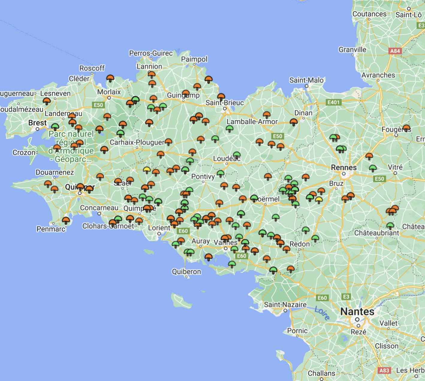 Découvrez les coins à cèpes de Bretagne, les zones les plus propices à la pousse des cèpes. Nous avons répertorié 50 zones à cèpes des pins, 101 zones à cèpes de Bordeaux et 2 zones à cèpes d’été.