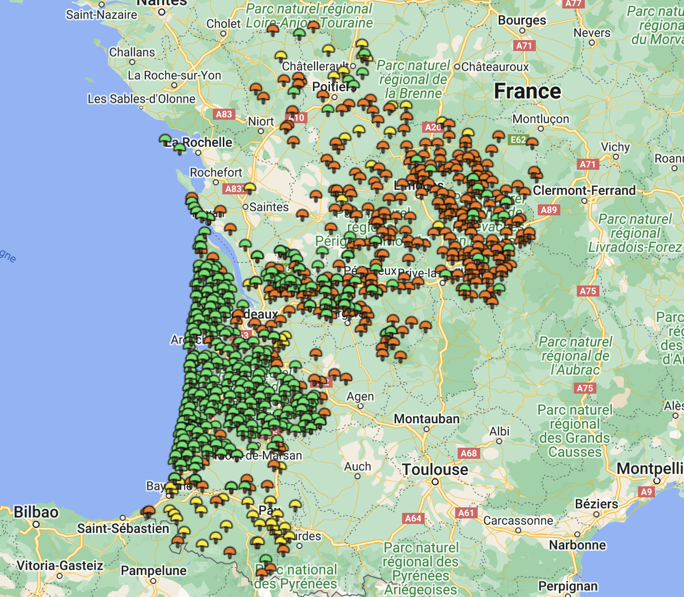 Découvrez les coins à cèpes de Nouvelle-Aquitaine, les zones les plus propices à la pousse des cèpes. Nous avons répertorié 388 zones à cèpes des pins, 379 zones à cèpes de Bordeaux et 56 zones à cèpes d’été.