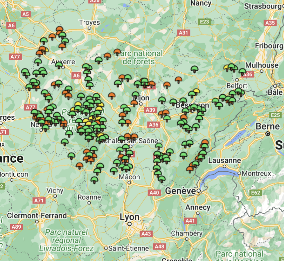 Notre carte des coins à girolles est un outil précieux car elle repose sur une analyse précise des conditions idéales de pousse : type de sol, essence des arbres, humidité et perturbations du terrain. Grâce à cette carte, vous multipliez par 10 vos chances de trouver des girolles. Plus vous vous rapprochez des zones ciblées, plus vous augmentez vos chances, car ces champignons restent imprévisibles mais suivent des conditions favorables bien définies.